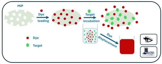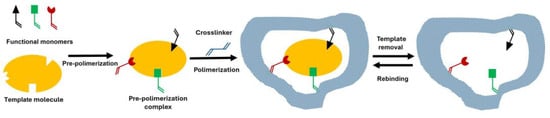 MIPs are synthetic materials designed to have specific recognition sites for a target molecule or a group of molecules. These recognition sites are created through a process known as molecular imprinting, where a template molecule (usually the target analyte) is “imprinted” into a polymer matrix. The process involves the polymerization of functional monomers in the presence of the template, which forms a three-dimensional network around the molecule. Once the template is removed, the resulting polymer retains cavities that are complementary in shape, size, and functional group arrangement to the template [21]. Scheme 1 shows a representation of the molecular imprinting process. In molecular imprinting, the extraction of the template from the imprinted polymer is a critical step, as some residual template may remain even after extensive washing, potentially causing later interferences. In such cases, a dummy template is used instead of the target analyte [43]. This is particularly necessary when the target is present in low concentrations, unstable, toxic, or susceptible to leakage due to incomplete template extraction or dissociation during polymerization.