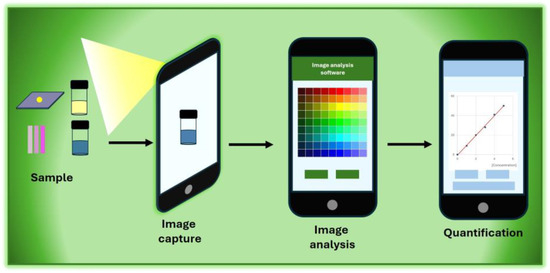 Concentration levels are difficult to distinguish with the naked eye, so imaging processing software (Adobe Photoshop, Image J, etc.) is necessary to link quantified images data and analyte concentration [90] (Scheme 2). The accuracy of smartphone-based colorimetry can be influenced by factors like camera angle, sample distance, and ambient lighting, which may reduce its precision compared to specialized equipment [91]. However, with the use of specific algorithms, smartphone-based colorimetry offers a broader measurement range, with a comparable limit of detection, compared to absorbance-based models [92].