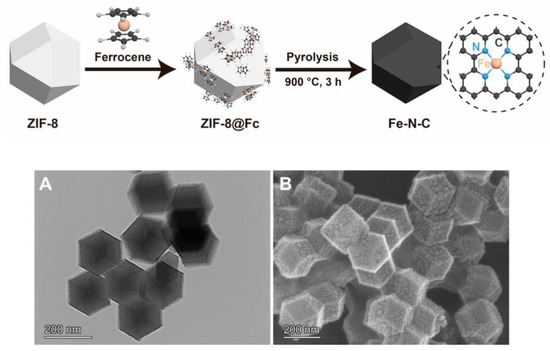 Schematic illustration of the synthesis process for Fe-N-C and TEM (A) and SEM (B) images of Fe-N-C. Adapted from [145]. Copyright © 2023 by the authors.