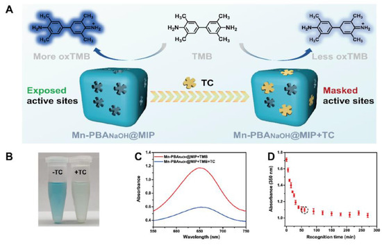 (A) Principle for the tetracycline (TC) induced inhibition of oxidase-like activity. (B) Image of the TMB+ Mn-PBANaOH@MIP reaction system with or without the participation of TC. (C) UV–vis patterns of various reaction systems. (D) Optimization of the time for TC recognition. Reprinted with permission from ACS Appl. Mater. Interfaces 2023, 15, 20, 24736–24746. Copyright © 2023 American Chemical Society [167].
