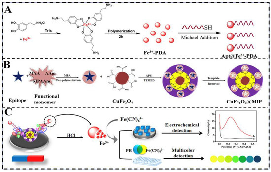 Polymerization is typically carried out using one of the following methods [50]: (i) Bulk polymerization involves mixing the template, monomer, crosslinking agent, and initiator in a solvent and sealing it under vacuum for crosslinking. It offers simplicity and a single system but results in irregular shapes, complex post-processing, and difficulty in template elution [51,52]. (ii) Suspension polymerization disperses the organic phase with the components in a solvent, which is then stirred. This method yields uniform particle size and stable polymers but is complex and sensitive to material properties [53,54]. (iii) Precipitation polymerization creates molecularly imprinted microspheres (MIMs) by dissolving the template and components in a medium for polymerization. It is simple, with a large specific surface area, but requires large amounts of solvent and solvents with high viscosity [55,56]. (iv) Sol–gel method forms a gel from an inorganic precursor in the presence of the template. It offers mild operating conditions and good thermal and chemical stability, but the material is brittle and requires precise pH control [57,58]. (v) Electrochemical polymerization uses electrolysis to polymerize monomers on an electrode, offering simple equipment, adjustable structures, and uniform surface imprinting. However, electrode modification is necessary to enhance sensitivity [59,60].