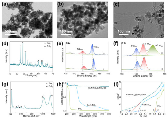 TEM images of (a) Co, N−TiO2, (b) ZrO2, and (c) Co,N−TiO2@ZrO2/3DGH. (d) XRD patterns of Co,N−TiO2@ZrO2/3DGH. XPS of (e) Ti 2p and (f) Zr 3d states in (I) Co, N−TiO2, (II) ZrO2 and (III) Co,N−TiO2@ZrO2/3DGH. (g) Raman spectra of Co,N−TiO2@ZrO2/3DGH. (h) UV–vis diffuse spectra and (i) corresponding Tauc plot curves of Co, N−TiO2, ZrO2 and Co,N−TiO2@ZrO2/3DGH.