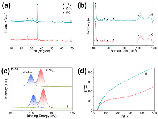 (a) In situ XRD patterns, (b) in situ Raman spectra, and (c) comparative XPS of the Zr 3d and (d) comparative EIS Nyquist plots of Co,N-TiO2@ZrO2/3DGH electrodes before (I) and after (II) MP exposure.