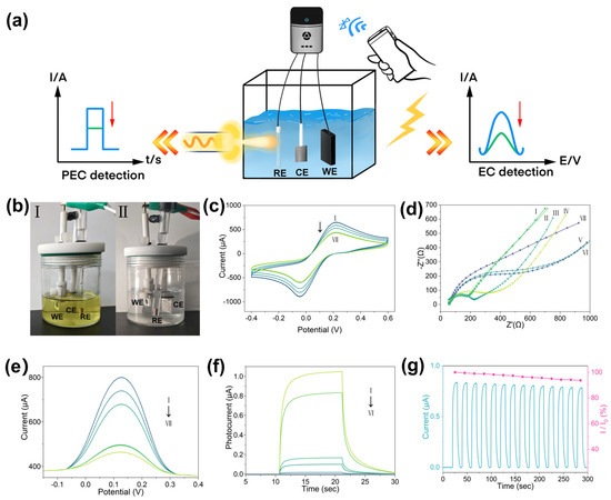 (a) Schematic diagram of dual-mode portable sensors; (b) picture of dual-mode portable sensor, (I) EC mode, (II) PEC mode; (c) CVs, (d) EIS and (e) SWVs of (I) Co,N−TiO2/3DGH, (II) TiO2/3DGH, (III) ZrO2/3DGH, (IV) Co,N−TiO2@ZrO2/3DGH, (V) Co,N−TiO2, (VI) TiO2 and (VII) ZrO2; (f) photocurrent responses of (I) Co,N−TiO2/3DGH, (II) Co,N−TiO2@ZrO2/3DGH, (III) TiO2/3DGH, (IV) Co,N−TiO2, (V) TiO2 and (VI) ZrO2/3DGH; (g) stability of Co,N −TiO2@ZrO2/3DGH electrode.