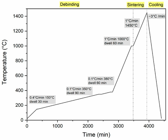 DLP printed monoliths were submitted to post-printing treatments: first, water debinding at 30 °C was performed to remove the hydro-soluble components of the resin and the uncured residual slurry; then, samples were dried in air and then in oven at 70 °C overnight. Thermal treatments were performed under air atmosphere in an electric furnace (Nabertherm, Nabertherm GmbH, Lilienthal, Germany), following a cycle previously optimized [36,38] (Figure 1): a slow thermal debinding up to 1000 °C allows to avoid crack formation during the polymeric component decomposition, while the sintering was completed at 1450 °C, maintaining a certain residual porosity in the mullite structure. Monoliths were then characterized in terms of ρ (g/cm3), geometrical density, determined by mass and geometric measurements, and by buoyancy method, following Archimedes’ principle (Density Determination Kit, Sartorius YDK01, Göttingen, Germany). The measurements were related to the mullite theoretical density of 3.17 g/cm3.