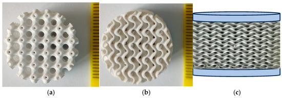 Three-dimensional printed mullite sensor structures with the following architectures were prepared: Schwartz with thicknesses of 4 (S1) and 6 mm (S2), and Gyroid with thicknesses of 4 (G1) and 6 mm (G2). Images of the printed sensors are reported in Figure 4: (a)—Schwartz, (b)—Gyroid; (c)—schematic illustration of the sensor structure with aluminum tape as upper and lower electrodes.