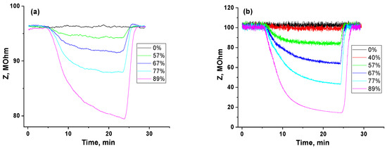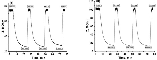 The response time, as well as the recovery time, were calculated as the time required by a sensor to achieve 90% of the maximum impedance variation in the presence of humid air and the time required for a sensor to reach 90% of the maximum impedance change in the case of gas desorption.