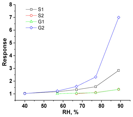 Response of sensors S1, S2, G1, and G2 at different RH values (in the range 40–89% RH).