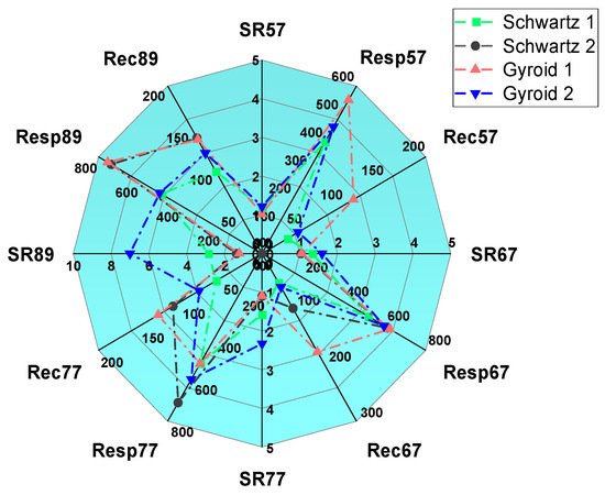 Radar plot of sensors characteristics (SR57 = sensor response dry air—57% RH, Resp57 = response time dry air—57% RH, Rec57 = recovery time dry air—57% RH, SR67 = sensor response dry air—67% RH, Resp67 = response time dry air—67% RH, Rec67 = recovery time dry air—67% RH, SR77 = sensor response dry air—77% RH, Resp77 = response time dry air—77% RH, Rec77 = recovery time dry air—77% RH, SR89 = sensor response dry air—89% RH, Resp89 = response time dry air—89% RH, Rec89 = recovery time dry air—89% RH; for SR57, SR67, SR77 and SR89: the higher the values, the better, for resp57, resp67, resp77, resp89, rec57, rec67, rec77 and rec89: the lower the values, the better).