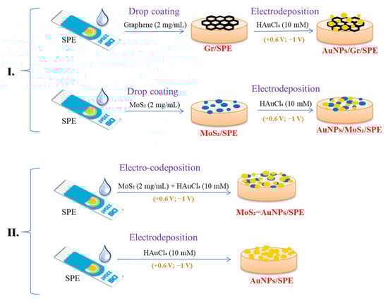 The dispersions of 2 mg/mL MoS2 and graphene and the solution of HAuCl4 10 mM used for electrodeposition were prepared in 0.5 M sulfuric acid. Both dispersions of 2D materials were homogenized for one hour in an ultrasound bath at room temperature. Two different working protocols were used to prepare the modified electrodes, as presented in Figure 1.