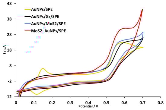 The electrochemical activity of AuNPs electrodeposited in three configurations—AuNPs/Gr/SPE, AuNPs/MoS2/SPE, and MoS2-AuNPs/SPE—was assessed through cyclic voltammetry in a 0.1 M H2SO4 electrolyte. The results were compared with the activity of AuNPs electrodeposited on bare gold electrodes employed as a control experiment (Figure 6). The voltammograms reveal distinctive anodic peaks specific to the gold oxidation process, as defined by the following reactions: