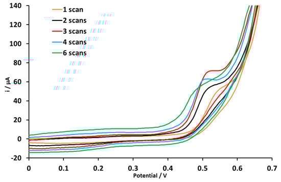 In the investigation of an electrocatalytic response to nitrite, the number and size of nanoparticles play a crucial role. To understand this influence, the impact of different deposition cycles was examined. Five electrodepositions were conducted by scanning the potential between +0.6 V and −1 V, each corresponding to a different number of cycles (1, 2, 3, 4, and 6 cycles). After electrodeposition, each electrode was examined by cyclic voltammetry with 0.4 mM nitrite in 0.1 M H2SO4 (Figure 8).