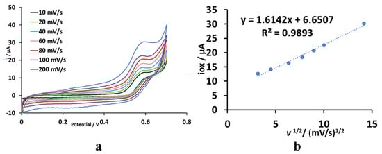 To better understand the electrochemical mechanism of nitrite oxidation, the CV curves of 0.2 mM NaNO2 in 0.1 H2SO4 were recorded at different scan rates from 10 and 200 mV/s for MoS2-AuNPs/SPE prepared with 2 mg/mL MoS2 (Figure 10a). The result showed that the anodic peak currents (Iox) of MoS2-AuNPs/SPE increased accordingly with the increase of the square root of the scan rate. Figure 10b indicates a good linear relationship of Iox vs. v1/2 from 10 and 200 mV/s (linear regression equations: Iox = 6.65 + 1.61v1/2, R2 = 0.9893). These results reveal that the electrochemical oxidation of nitrite at MoS2-AuNPs/SPE is a typical diffusion-controlled process.