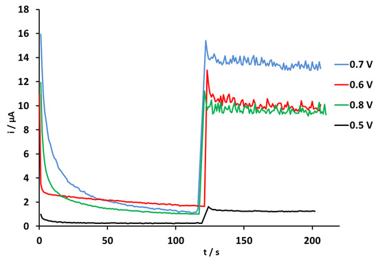 The voltametric findings affirm the feasibility of nitrite oxidation using MoS2-AuNPs/SPE, given appropriate optimization of working parameters for amperometric detection. Consequently, the influence of the applied potential was studied in order to enhance the sensor’s performance for the utmost sensitivity in nitrite determination. To investigate this relationship, we examined four distinct values of the applied potential (0.5, 0.6, 0.7, and 0.8 V), measuring the resultant oxidation current as an indicator of the nitrite oxidation process.