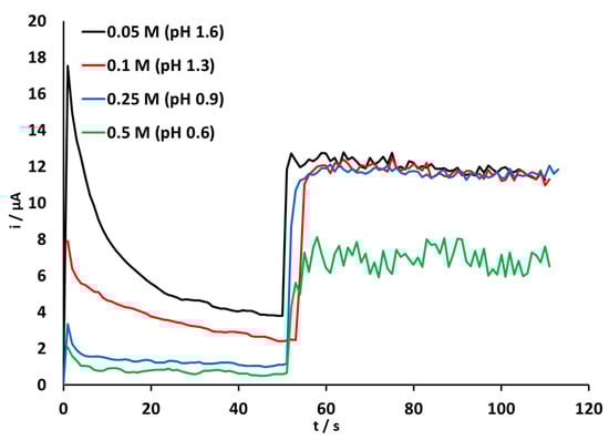 Using the optimal applied potential of 0.7 V, the influence of H2SO4 concentration on the electrochemical oxidation reaction of nitrite was investigated using the MoS2-AuNPs/SPE electrode. Figure 12 shows the amperometric response obtained for the oxidation of 0.1 mM nitrite, using different concentrations of the acid used as an electrolyte. The analytical signal demonstrates a positive correlation with the electrolyte concentration, peaking at 0.25 M. Subsequently, at a higher sulfuric acid concentration (0.5 M), the recorded current becomes less stable, exhibiting a decrease in intensity accompanied by an increase in noise. This phenomenon is attributed to the strongly acidic pH conditions, where the equilibrium of the reaction (reaction (4)) is not favored in the sense of oxidation, and the electronic transfer is correspondingly hindered. Consequently, for the following experiments, a sulfuric acid concentration of 0.25 M will be employed for all subsequent experiments in the electrochemical determination of nitrite, as it consistently delivered enhanced stability and a stronger oxidation current, thereby supporting improved sensitivity and overall sensor performance.