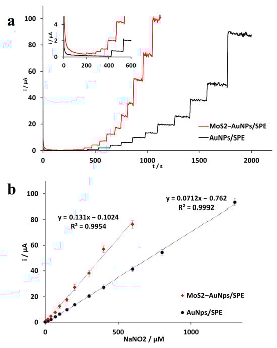In order to evaluate the analytical performance of the chemically modified electrodes for the determination of nitrite, they were amperometrically calibrated by measuring the analytical signal for successive additions of nitrite in a 0.25 M H2SO4 electrolyte, applying a constant potential of 0.7 V, under continuous stirring. Figure 13a shows the nitrite oxidation current recorded over time for the MoS2-AuNPs/SPE electrode (a) compared with the signal recorded for AuNPs/SPE (b) used as the control experiment. In both cases, for each addition of nitrite in the electrochemical cell, the oxidation current increased rapidly until it reached the maximum value and stabilized after 2–3 s. The increase of the recorded anodic current was directly proportional to the nitrite concentration in the linear ranges of 0.5–600 μM for the MoS2-AuNPs/SPE configuration and 20–1300 μM for the AuNPs/SPE configuration.