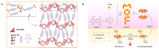 Xu et al. [48] proposed a new luminescent rare earth metal–organic framework counting strategy, which employs a bi-ligand structure of benzene tetracarboxylic acid and imidazolium dicarboxylic acid to construct the Tb-MOF backbone, enhance its stability in an aqueous environment, and provide a multisite coordination structure to optimize fluorescence performance. SiO2 layers and molecularly imprinted polymers were introduced on the Tb-MOF surface to improve the selective recognition of the insecticide imidacloprid (IDP).