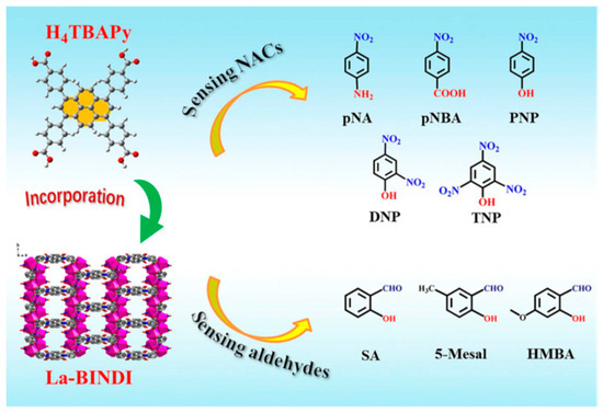 With the deepening of research, People’s demand for organic ligands is not only limited to the enhancement of fluorescence intensity of rare earth metals but also desires to have concomitant properties such as luminescence properties and functional sites. Xing et al. [41] exploited the strong conjugation utility and unique optical properties of 1,3,6,8-tetrakis(p-carboxybenzoic acid)pyrene (H4TBAPy) ligand by coordinating with lanthanide metal ions, such as Sm3+, La3+, and Nd3+ lanthanide metal ions, to form RE-MOFs with porous three-dimensional structure, which facilitates the entry of the molecules to be measured into the channel for binding to the sensing site. This ligand not only facilitates photosensitization but also provides more active sites through the coordination of its carboxyl group with the metal (Figure 3). Zheng et al. [42] chose 4,4′-(quinoline-5,8-diyl)benzoic acid (QBA) with strong light-absorbing capacity as an organic ligand to coordinate with Yb3+. The “antenna effect” was used to significantly enhance the near-infrared fluorescence emission of Yb3+, and the abundant nitrogen-oxygen functional sites were used to promote strong interactions between the target molecules and the frameworks. Yang et al. [43] chose 2-amino-terephthalic acid (H2ATPA) as a ligand for coordinating with Sm3+ to form a three-dimensional network structure with high rigidity and open coordination sites. Among them, the free amino group was not involved in the coordination of Sm3+, which provided a reaction site for the detection of Hg2+ and enhanced the fluorescence emission of Sm3+ to achieve the “open” fluorescence response. Zhang et al. [44] used 4,4′-(4,4′-bipyridyl-2,6-diyl) dibenzoic acid (bpydbH2) as a ligand to form a three-dimensional network structure with europium ions, resulting in a highly rigid framework with open coordination sites. This structure provides open Lewis basic sites for enhanced selective binding to the metal ions being detected.