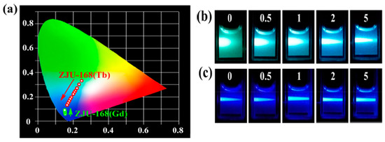 (a) CIE chromaticity diagram showing the color enhancement of ZJU-168(Tb) and ZJU-168(Gd) with the increase in Glu from 0 mM to 5 mM. (Based on the Commission Internacionale d’Eclairage (CIE 1931) chromaticity diagram) (b,c) Photographs of ZJU-168(Tb) and ZJU-168(Gd) with the increase in Glu from 0 mM to 5 mM [70]. Copyright 2020, American Chemical Society.