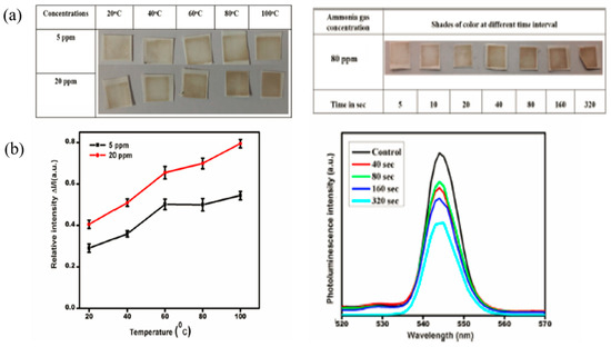 The ability of MOF thin film for fluorescence and colorimetric sensing of ammonia: (a) Change in the color of Mn-BDC thin films; (b) Change in PL intensity of Tb-BTC thin films (excitation wavelength = 235 nm, emission reading = 545 nm). [84]. Copyright 2021, Elsevier.