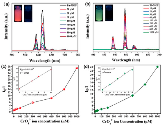 Luminescent titration of Eu-MOF (a) and Tb-MOF (b) upon incremental addition of CrO42−. SV plots of Eu-MOF (c) and Tb-MOF (d) upon different concentrations of CrO42− ions (inset: the linearity relationship of luminescent quenching at low concentrations) [96]. Copyright 2020, American Chemical Society.