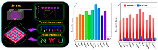 - Lu, X.; Tang, Y.; Yang, G.; Wang, Y.-Y. Multifunctional lanthanide MOFs with active sites as new platforms for smart sensing of methylmalonic acid and anti-counterfeiting applications. J. Mater. Chem. C 2023, 11, 2328–2335. [Google Scholar] [CrossRef]