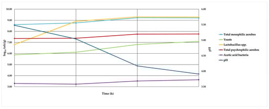 Lactobacillus spp. (yellow line), total psychrophilic aerobes (red line), and acetic acid bacteria (purple line), with pH represented on the right-hand axis by the dark blue line. Measurements were conducted at four distinct time points: at the beginning of fermentation (0 h), after 4 h, after 20 h, and beyond 24 h.