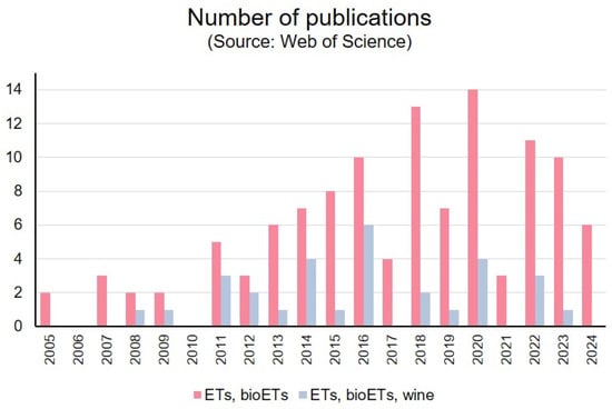 Number of publications on ET and BioET in the wine industry published in the past few years (source: database Web of Science). Topics: Electronic tongue, bioelectronic tongue, and wine.