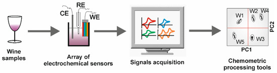Although there are several methods to determine quality parameters of interest in the wine industry, they are usually long, tedious, and require very expensive laboratory equipment and qualified personnel. Moreover, the quality control that evaluates the organoleptic properties of wines, such as flavor, taste and color, is usually tested by a trained, expert human panel (wine-tasters) turning out a strong subjective element in the results that are influenced by their skills, mood and/or physical state [14]. Moreover, the number of tests that panelists can perform is limited to a few assessments per day, due to the saturation of tongue receptors. As time is a critical factor in the food industry, it is necessary to develop new, simple, and fast analytic tools able to assess antioxidant activity and organoleptic properties, as well as the authentication of wines and grapes, and geographic origin verification. These factors are becoming very important due to wine regulations, which include rules concerning the marketing, production, designations of origin and geographical indications, among others, becoming more restrictive than in the past with the final objective of protecting consumers in order to supply beverages and food that are safe, of good quality and exempt from fraud.