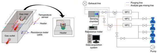 2D nanomaterials exhibit high electron conductivity and remarkable mechanical strength owing to their quantum and surface effects, and numerous 2D materials have been extensively utilized for the trace detection of analytes [,,]. The sensor parameters of 2D nanomaterials not only rely on nanostructure and electrophysical parameters but also on the density and diameter of nanopores in NS and NF []. Additionally, the distance between the air intake and the sensor, as well as the direction of the air intake, also exerts an influence on the performance of the sensor. Ryu et al. [] developed a test bench to assess the response characteristics of MOS2-based gas sensors under NO2 airflow (Figure 3). The experiment revealed that when the gas inlet direction is perpendicular to the surface of the gas sensor, the sensitivity of the sensor is the highest, reaching 4.29%. As the distance to the surface of the 2D gas sensor is reduced from 4 mm to 2 mm, the sensitivity of the sensor increases to 9.20%. 2D nanomaterials coated on plastic, paper, or textile substrates can form flexible, stretchable, and portable gas sensors. However, the development in this field has been sluggish, and most research work on MXene nanocomposite gas sensors has been applied to rigid substrates []. Modification with precious metals such as Au, Pt, and Pd can enhance the selectivity of MXene-based gas sensors towards different gases [].