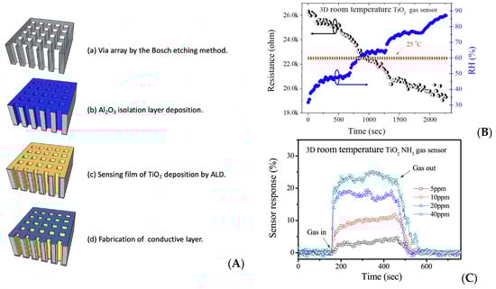 (A) Schematic image of the fabrication process for the 3D TSV-structured TiO2 gas sensor. (B) The influence of the ambient temperature and humidity on the TiO2 gas sensor. (C) Sensor response for the TiO2 gas sensor for various NH3 concentrations [].