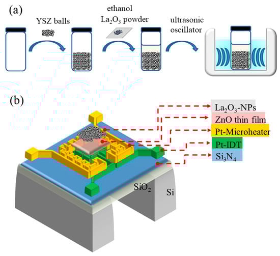 (a) The processing steps for La2O3-NPs. (b) The structure of the La2O3-NPs/ZnO/MEMS gas sensor [].