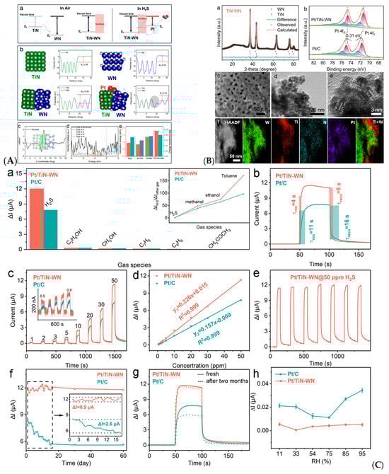 Gas sensors founded on electrochemical principles are frequently employed to detect hydrogen sulfide. This sort of sensor operates by gauging the electrical current produced through an electrochemical reaction of hydrogen sulfide at the sensing electrode. They are highly sensitive and selective and are capable of detecting hydrogen sulfide at concentrations as low as a few parts per billion (ppb) [,]. Medvedeva et al. [] fabricated and tested electrochemical gas sensors with thin-film nanocomposite electrodes in diverse gas environments, and the experimental outcomes demonstrated that A-C/Pt exhibited higher sensitivity and stability for the continuous monitoring of H2S gas in comparison with major products of the same kind produced on a large-scale. Nevertheless, traditional Pt-based catalysts are frequently constrained by their electronic structure and stability. In this respect, Zhang et al. [] put forward a Pt/TiN-WN composite sensor, which attains electron accumulation on the surface of Pt, thereby generating enhanced conductivity and abundant active sites (Figure 10). It achieves a response current of 12.2 μA, 1.7 times that of Pt/C (7.1 μA). It also displayed excellent linearity (R2 = 0.999).