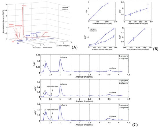 (A) Dynamic response of the SnO2 gas sensor. (B) Function of the biomarker concentration in the mixture. (C) Dynamic response of the gas sensor as a function of the adsorption time [].