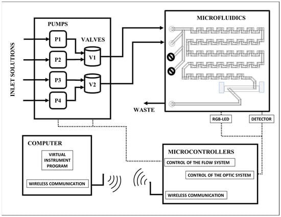 Figure 1 shows the scheme of the proposed device for microanalytical applications. For the fluid management, a compact flow device based on patent number 359937 IMPI [] was implemented, in which all the steps of the microanalytical process were included. The hydrodynamic variables in each developed experiment, flow rate (Q), volume (V), mixing time, and wavelength (λ) for optical detection were programmed on a virtual instrumentation program. For details of this operating principle, the reader is referred to [].