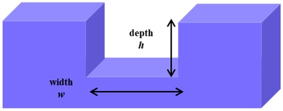 In microfluidics, the mixing occurs at very small Re and is mainly based on molecular diffusion, DM [] and laminar behavior in microchannels, reactors, heaters, etc. In the internal geometries of microfluidic structures, the flow rate can be increased or decreased by channel geometry. A microchannel usually has an aspect ratio between depth (h) and width (w) of 1:10 (w >> h) considering a maximum hmax = 0.5 mm and minimum wmin = 0.05 mm for silicon, glass, and PDMS structures using the soft lithography process []. After extensive analysis and experimentation, an aspect ratio of w > h with hmin = 0.215 mm and wmax = 1.3 mm was defined [], see Figure 2.
