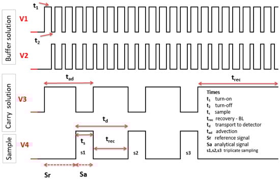 For the injection process, the volumes were programmed as a function of time and the flow rates were generated by frequency, as shown in Figure 4. According to this study, the complete injection sequence was programed in virtual interface, shown in Figure 5. In this example, sampling was programmed in triplicate (i.e., 3 samples were analyzed in three cycles = 3), trec is recovery time between each sample, t1 (turn on) and t2 (turn off) are the mixing time that must be considered in the microvalve multicommutation (tdif), td is the time it takes from the injection of the sample until it reaches the detection section, tm is the time at which the sample volume is injected, and te is the dispersion time (Figure 3: tBL= td − tdif). The time from when the solutions are injected to when they reach the detector is called the advection time (tad).