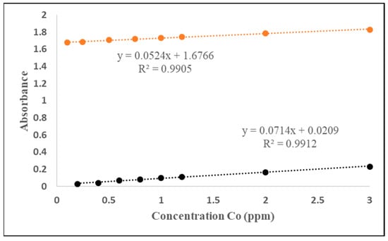 Figure 8 shows the calibration curves and the experimental data: the black points represent the absorbance measured by a commercial spectrometer (operating at λ = 540 nm) for the sample resulting from chemical agents with given Co concentrations, homogenized by the magnetic stirrer, and the black cut line corresponds to the linear approach. The orange points represent the absorbance measured by the microanalyzer (operating at λ = 525 nm) for different Co concentrations. In this case, the mixture was homogenized by the 3D serpentine micromixer of the microanalyzer. We observe that the linear approximations showed slightly different slopes, due to the wavelength used to estimate the absorbance. Statistically, both mixing and measuring methods showed similar trends: from the linear fit, we have R2 = 0.9912, and s R2 = 0.9905 for the spectrometer and microanalyzer, respectively.