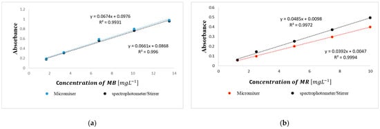 The PLA filament specifications do not allow the use of corrosive solutions. Therefore, colored solutions were used instead. With a v′ = 1.3 mm2 s−1, Re = 49.7 and Pe = 49708, ensuring fast and optimal mixing. The PLA micromixer was evaluated using dilutions based on a stock solution of C16H18CIN3S (methylene blue, MB) at 25.11 μM concentration, measured at λ = 624 nm and another stock solution of C15H15N3O2 (methyl red, MR) at 37.13 μM measured at λ = 460 nm []. Figure 10a shows the calibration curve to the MB dilution and Figure 10b MR dilutions, both developed by two types of mixers using the magnetic stirrer and the absorbance was estimated with a Jenway 6305III spectrophotometer, obtaining for MB, R2 = 0.996, and for MR, R2 = 0.9972. The graph represents the absorbance measurements resulting from the mixture developed by the 3D serpentine micromixer for MB, where R2 = 0.9931 and for MR, R2 = 0.9994.