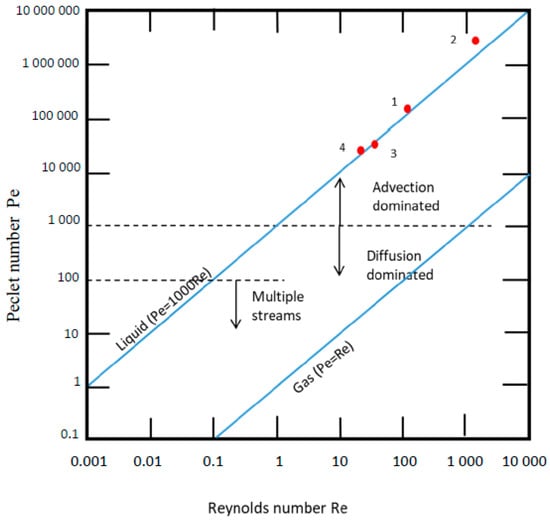 Operation ranges of micromixers. The data for the red points were determined based on reported geometry data and velocity (flow rate) data described in Table 1. Operation points of passive mixers based on chaotic advection and active mixers can be distributed around the two lines Pe = 1000Re for liquid and Pe = Re for gases [].