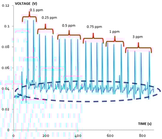 To validate if a signal is clear and significant, a signal–noise ratio (SNR) should be SNR > 3. In this case, SNR was calculated as SNR = Sa/Sn. Based on the data from Figure 13, Sa = 105.60 mV and Sn = 2.6 mV, SNR = 40.5, where Sa is the analytical signal (e.g., sample 0.1 ppm) and Sn is the standard deviation of the baseline signal noise.