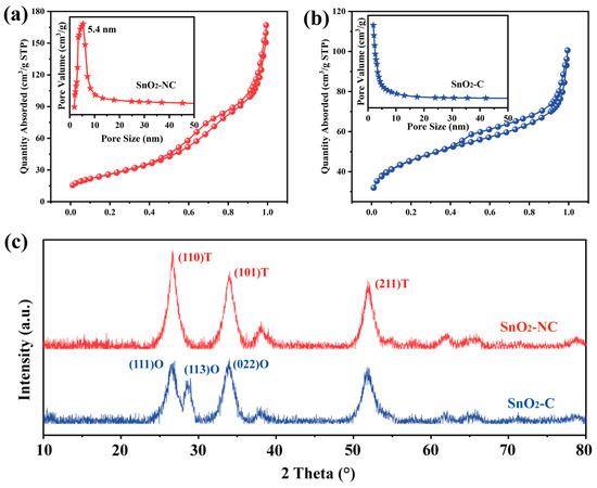 To verify the above hypothesis, N2 adsorption measurements were carried out. As shown in Figure 3, both SnO2-NC and SnO2-C exhibited type IV isotherms with the indicative microporosity. For SnO2-NC (Figure 3a), a distinct hysteresis loop appeared at p/po = 0.4–1.0, characteristic of capillary condensation within mesopores [26]. The SnO2-NC sample showed a BET surface area of 165.12 m2g−1, a pore volume of 0.26 cm3g−1, and an average pore diameter of 9.69 nm. The pore size distribution (inset) revealed a sharp peak at 5.4 nm, indicating the presence of uniform mesopores formed by the thermal decomposition of the MOF-derived framework, which facilitated efficient gas diffusion and access to active sites. In contrast, SnO2-C (Figure 3b) showed a narrower hysteresis loop and lower adsorption capacity. It exhibited a BET surface area of 95.8 m2g−1, a pore volume of 0.11 cm3g−1, and an average pore diameter of 6.88 nm. The broader distribution centered at smaller pore sizes suggested a more disordered porous structure, likely resulting from nanoparticle aggregation. These results confirmed that the introduction of CTAB significantly influenced the calcined structure, suppressing pore formation and reducing surface area, which may hinder reactant accessibility and thereby limit the sensing or catalytic performance. Nevertheless, the subsequent sensing results demonstrated that surface area alone was not the decisive factor for gas sensing performance. This further underscored the potential of crystal phase engineering as an effective strategy for constructing high-performance gas sensing materials.