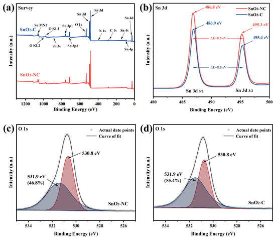 The XPS survey spectra of SnO2-C and SnO2-NC samples (Figure 4a) showed the presence of Sn, O, and C elements in both materials. The Sn 3d peaks located at approximately 487 eV and 496 eV correspond to the existence of Sn4+, while the O 1s peak around 531 eV was attributed to lattice oxygen or surface hydroxyl groups. The C 1s peak and the weak N 1s signal might originate from background or incomplete decomposition of the organic framework during calcination. In addition to the main peaks, the samples also exhibited other characteristic Sn and O signals, such as Sn 3s, 3p, 4s, 4p, and the Sn MN1 (Auger peak), further confirming the typical electronic structure of SnO2. The detailed Sn 3d spectra (Figure 4b) indicates that the Sn 3d5/2 peaks occurred at 486.8 eV and 486.9 eV for SnO2-NC and SnO2-C, respectively, while the Sn 3d3/2 peaks were positioned at 495.3 eV and 495.4 eV. These values were in excellent agreement with previously reported binding energies for Sn4+ in SnO5/2 [30]. Notably, the absence of any shift toward lower binding energies excluded the presence of Sn2+ species, which would be expected if SnO were present, as Sn2+ exhibited a lower binding energy than Sn4+. Taken together with the structural analysis, these results support the hypothesis that oxygen-deficient SnO2 (O-SnO2) was formed in SnO2-C.