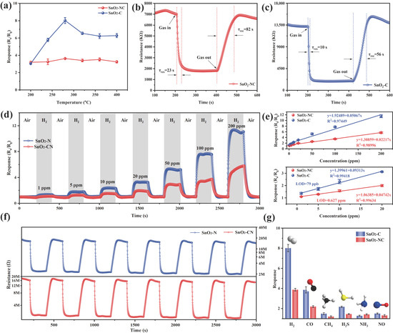 (a) Gas sensing performance of SnO2-NC and SnO2-C toward 100 ppm H2 under different operating temperatures; real-time resistance variations (b,c), reproducibility of sensor responses (d) and cyclic response and recovery behavior (f) of SnO2-NC and SnO2-C upon exposure to 100 ppm H2 at 280 °C; (e) relationship between sensor response and varying H2 concentration; (g) selectivity profiles of SnO2-NC and SnO2-C sensors to 100 ppm of different target gases at 280 °C.