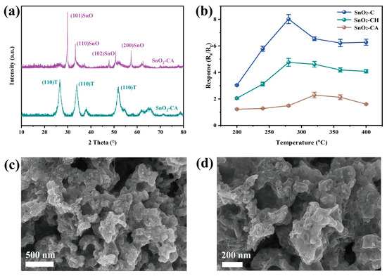 (a) XRD patterns and (b) responses toward 100 ppm H2 at various operating temperatures of SnO2-CH and SnO2-CA, (c,d) SEM images of SnO2-CA.
