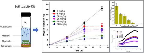 The schematic diagram (Figure 1) depicts a solid-phase soil toxicity test kit that utilizes algal balls. This kit was constructed with a 25 mL flat-bottom glass vial, which includes a plastic cap and a rubber stopper that is lined with Teflon (Figure 1). The present study utilized standard soil Lufa 2.2, which was amended with different concentrations of heavy metals. Individual glass vials, each containing soil (0–4 g) and 15 mL of BG 11 media, received separate groups of five algal balls. These groups were characterized by initial concentrations of 5 × 104, 1 × 105, and 2 × 105 cells/mL. As a negative control, alginate beads lacking algae were employed. The purging of nitrogen gas into the headspace of the kit for 1–2 min successfully displaced the initial oxygen from that environment. The measurement of gaseous phase photosynthetic oxygen evolution was conducted using a needle-type oxygen sensor during a 72 h incubation of the test kit, which received uninterrupted illumination at an irradiance of 185 µmol·m−2·s−1, with a controlled temperature of 25 ± 1 °C. All toxicity tests were performed in triplicate with negative controls (alginate balls without algae) to exclude the dissolved phase oxygen in the liquid portion. Following a 72 h incubation period, the algal balls were extracted from the test kit, rinsed with distilled water, and subsequently dissolved in 0.5 N sodium citrate to facilitate the measurement of optical density and chlorophyll content. This kit was employed in three different tests: (1) Control test to evaluate the impact of different amount of soil on oxygen evolution by microalgae; (2) optimization tests focused on discovering the most favorable conditions for the test kits regarding the photosynthetic performance of Chlorella vulgaris, particularly by manipulating initial algal cell densities and mixing speeds; and (3) toxicity tests aimed to assess the harmful effects of soils enriched with heavy metals.