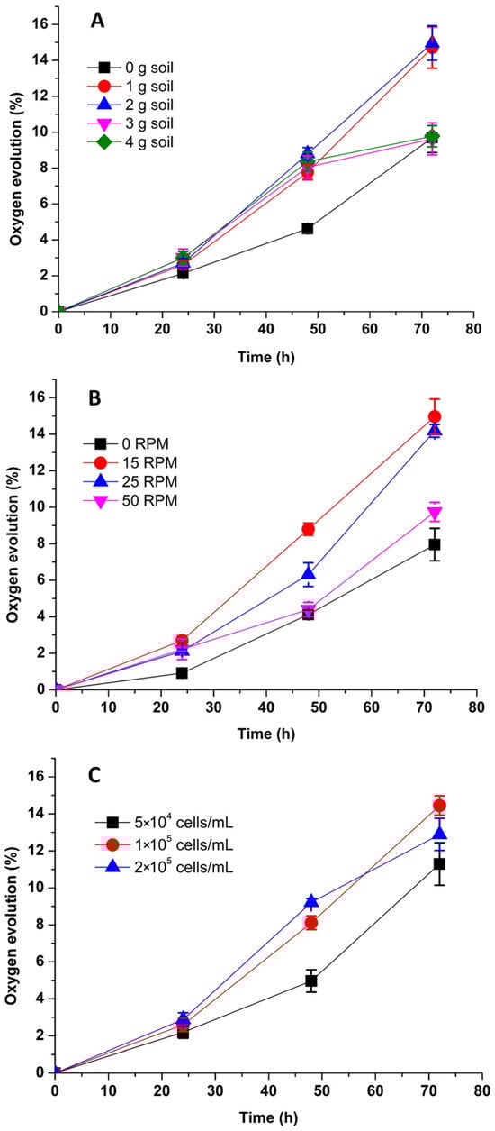 The present study was optimized by investigating the impact of the amount of soil, mixing intensity, and initial cell concentration. Different amounts of soil (1, 2, 3, and 4 g) were used to determine the most favorable operating conditions. Increasing the amount of soil showed an inverse relation to photosynthetic oxygen evolution (Figure 2A). Up to 1–2 g soil showed no significant difference in oxygen evolution (14.47% and 14.70%), while, as the amount of soil was increased from 3 to 4 g, oxygen production significantly decreased (9.77–9.62%). In terms of mixing intensity, 15 rpm (revolutions per minute) resulted in the maximum oxygen evolution (14.96%) in the headspace of the kit over 72 h incubation period, while 0, 25, and 50 rpm showed 7.95, 14.28, and 9.74% of oxygen evolution, respectively (Figure 2B). In terms of the initial cell density, a concentration of ×105 cells/mL exhibited the greatest oxygen evolution at 14.45% over a 72-h incubation period. This was in contrast to the densities of 5 × 104 and 2 × 105 cells/mL, which resulted in oxygen evolutions of 11.9% and 12.8%, respectively, as measured in the headspace of the bioassay kit (Figure 2C). The amount of soil and mixing intensities are significant factors impacting the activity of microalgae because high amounts of soil and high mixing intensities may increase turbidity and result in inhibiting photosynthetic activity. In the present study, 2 g of soil, a 25 rpm mixing intensity, and 1 × 105 cell/mL cell densities were found to be optimal operating conditions.