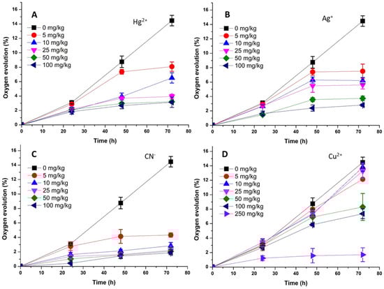 Inhibition of photosynthetic oxygen evolution in solid-phase microalgae (C. vulgaris) bioassay of soil contaminated with varying concentrations of (A) mercury, (B) silver, (C) cyanide, and (D) copper over 72 h incubation period. The vertical bars represent the standard deviation (n = 3).