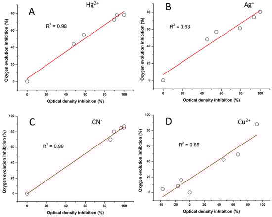 Correlation of photosynthetic oxygen evolution inhibition and optical density inhibition of C. vulgaris treated with heavy metals for 72 h: (A) mercury, (B) silver, (C) cyanide, and (D) copper.