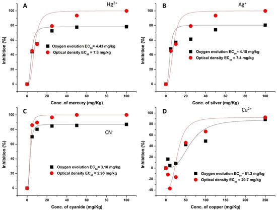 Dose-response curve showing effective concentrations at which 50% population is inhibited on the basis of oxygen evolution and optical density in solid-phase microalgae bioassay for soil contaminated with varying concentrations of (A) mercury, (B) silver, (C) cyanide, and (D) copper over 72 h incubation period.